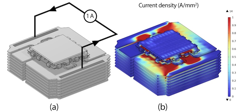 Figure 2. (a) Isometric view of the COMSOL simulation model showing the GaN FET and PCB geometry. (b) Example simulation (8L_Board) output illustrating current density distribution. Image used courtesy of Bodo’s Power Systems [PDF]
