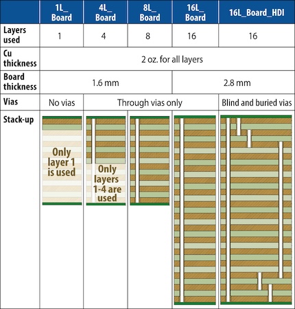 Figure 3. Cross-sectional views of the representative PCB stack-ups studied. The far-right example demonstrates a high-density interconnect (HDI) structure, while the others employ conventional throughvias. Image used courtesy of Bodo’s Power Systems [PDF]