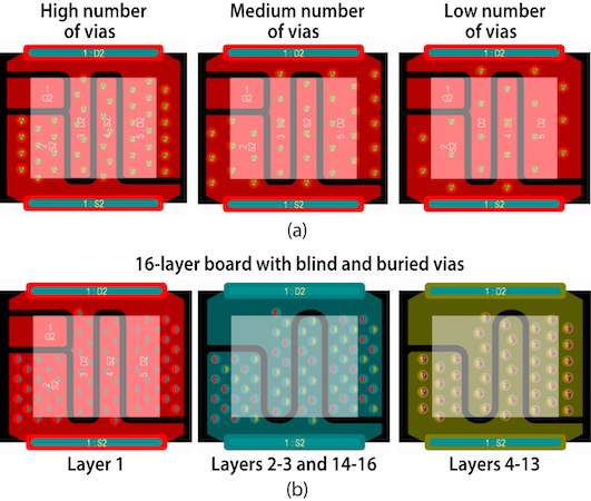 Figure 4. (a) Top view of the layout showing the via densities analyzed. (b) Top view of the 16-layer board with HDI technology showing the placement of blind and buried vias. Shadow represents GaN die placement. Image used courtesy of Bodo’s Power Systems [PDF]