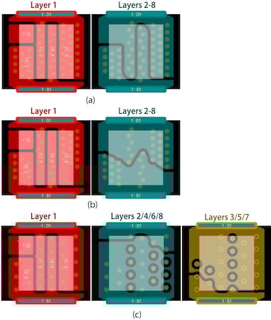 Finally, a third study was conducted to evaluate the layout used in the inner layers. Figure 5 displays the three alternatives considered. The first variant (Figure 5.a) uses an interdigitated layout repeated on all layers. The second variant (Figure 5.b) uses a split plane design where half the area under the device is dedicated to the drain or source terminals in all the inner layers.