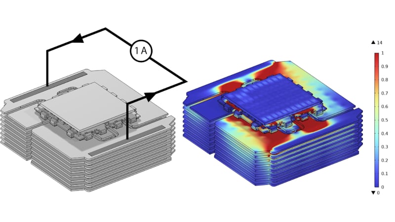 The resistance of the printed circuit boards (PCBs) was evaluated using finite element analysis (FEA) in COMSOL Multiphysics. PCB and package geometries were imported directly from Altium and 3D CAD models respectively. To reduce computational cost when analyzing the large number PCB variants, the imported layout was restricted to extend only one millimeter beyond the package footprint of the mounted packaged die.